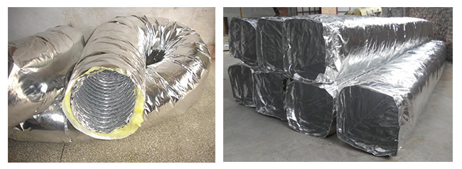 鋁箔復合玻纖布保濕軟管作空調(diào)末端送回風支管使用,保濕層厚度一般為2.5CM,也可根據(jù)用戶要求確定。